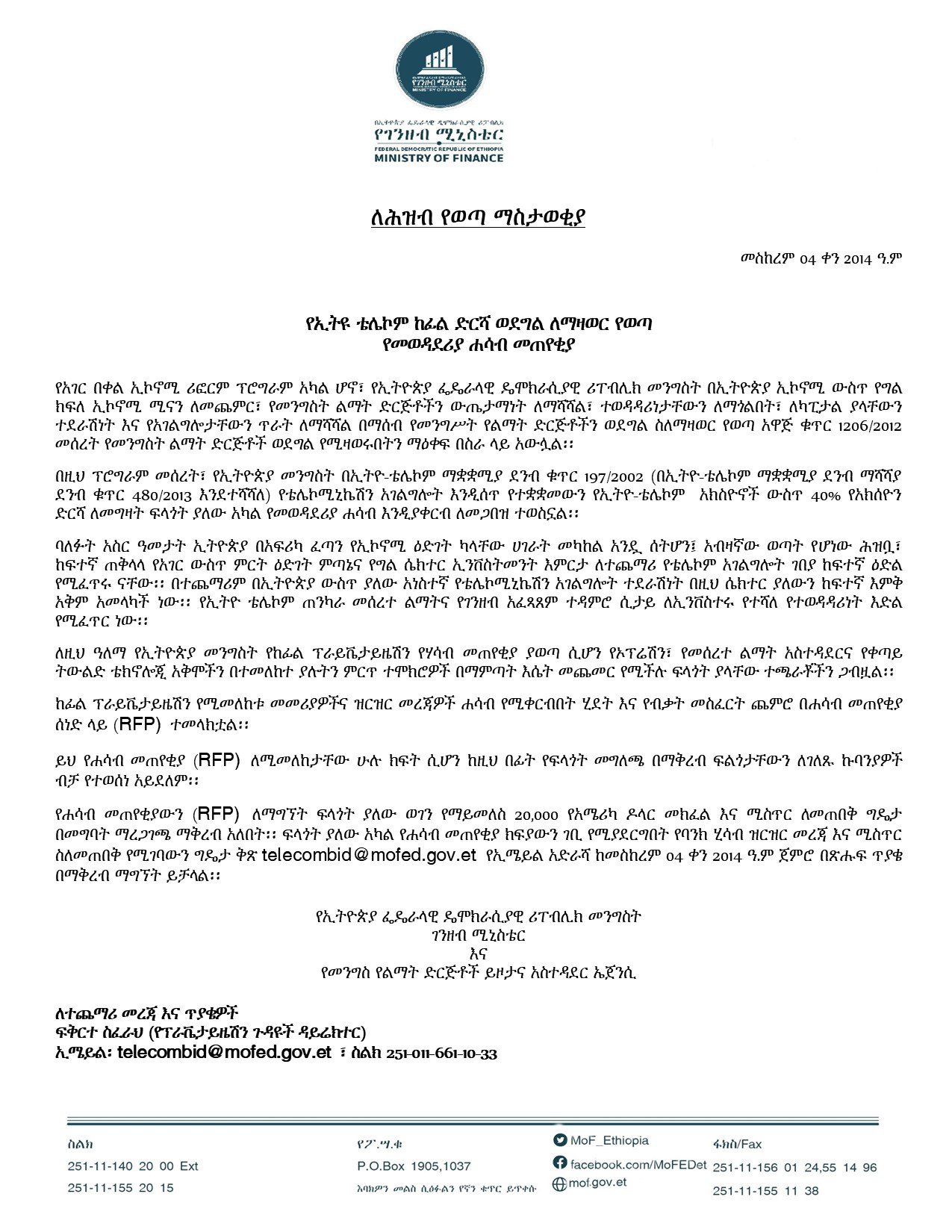 የኢትዮ ቴሌኮም ከፊል ድርሻ ወደ ግል ለማዛወር የወጣ የመወዳደሪያ ሃሳብ መጠየቂያ