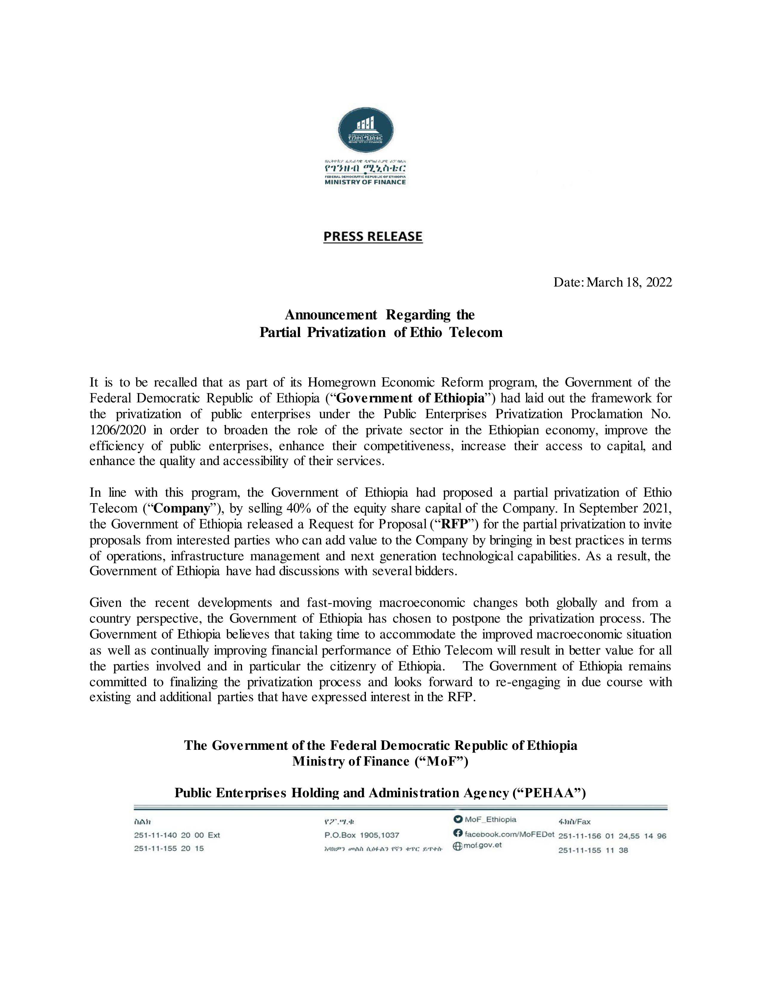 Announcement Regarding the Partial Privatization of Ethio Telecom By Yonas | Published: March 18, 2022