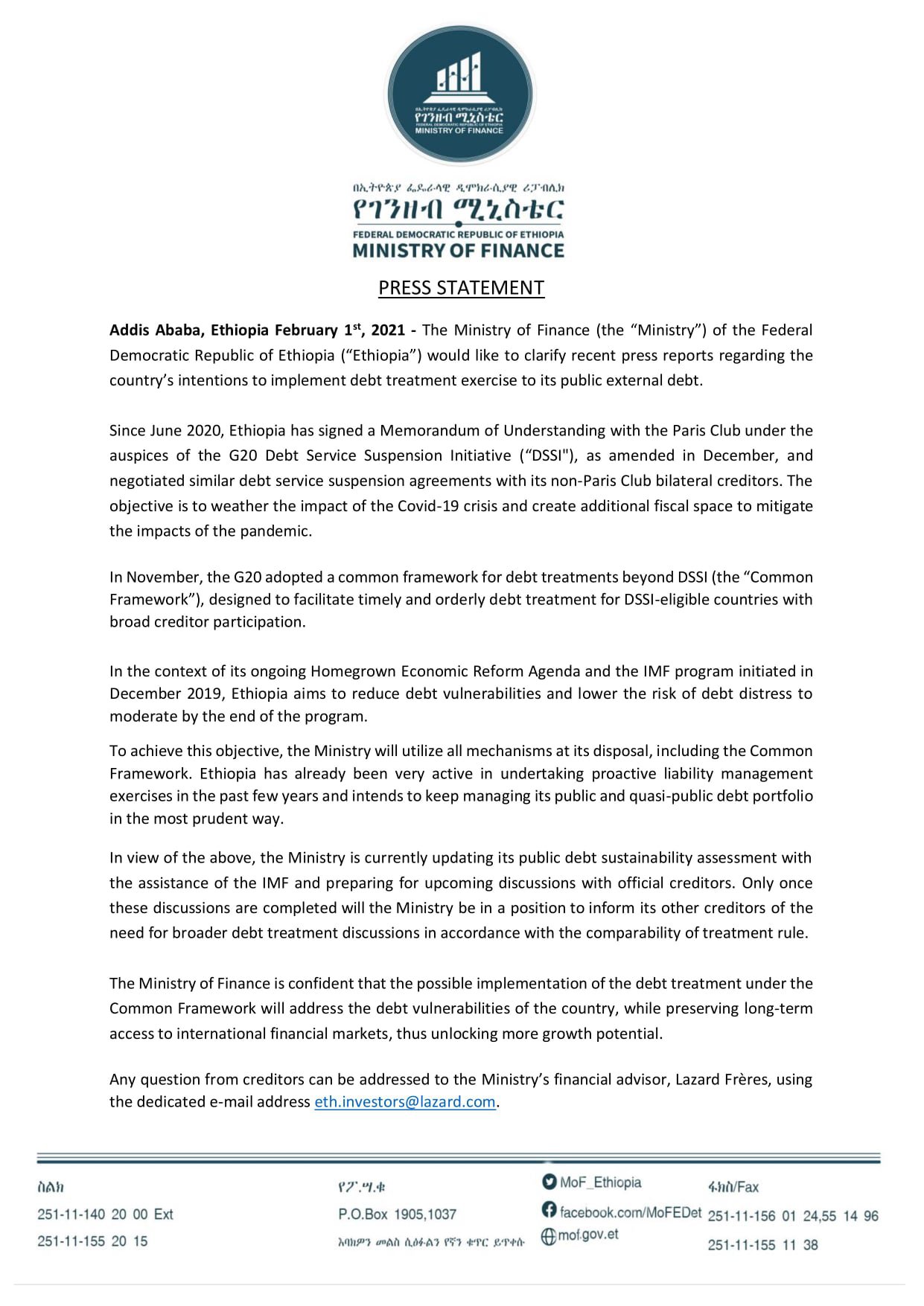 Ethiopia’s intentions to implement debt treatment exercise to its public external debt