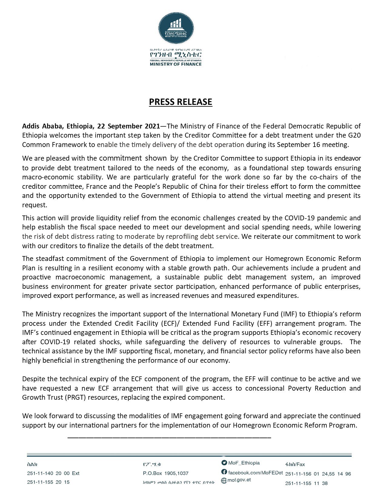 The Ethiopian Government concludes Memorandum of Understanding with its Official Creditor Committee Under the G20 Common Framework
